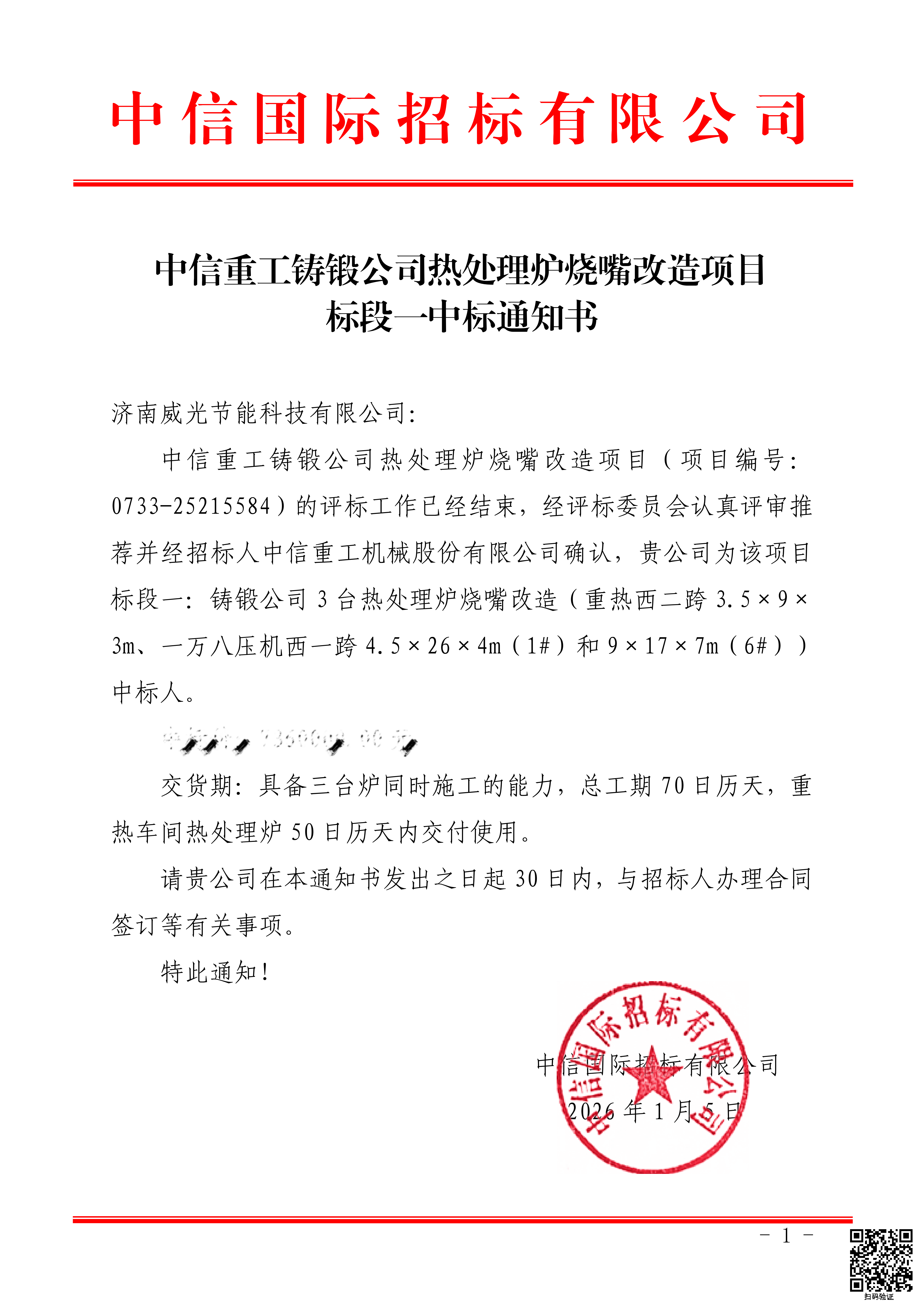 我公司于2026年1月5日中标中信重工铸锻公司热处理炉烧嘴改造项目标段一3台热处...